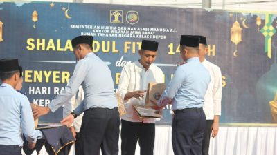 DEPOK, SJNews.com, – Pasca melaksanakan Shalat Idul Fitri bersama Warga Binaan Pemasyarakatan (WBP), Rutan Kelas I Depok melanjutkan kegiatan Penyerahan Remisi khusus Idul Fitri 1444 H kepada Narapidana. Kegiatan yang dilaksanakan di Lapangan Olahraga Rutan Kelas I Depok ini diikuti dengan penuh rasa syukur dan haru, (22/04/23).