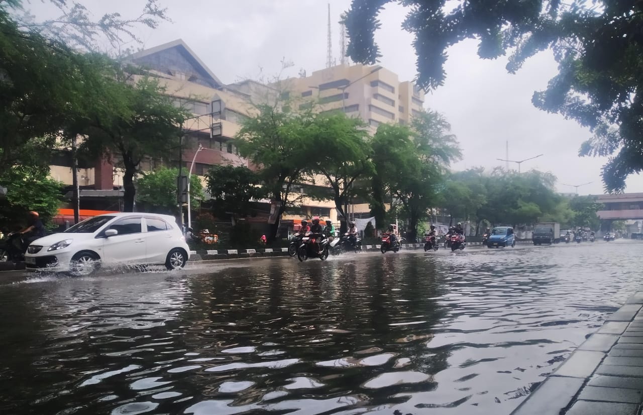 Tidak hanya di Mangga Dua saja,sejumlah ruas jalan di Pademangan banyak terdapat genangan air terutama di depan RSUD Pademangan, menjadi sasaran anak anak untuk bermain air, pengendara nampak sangat berhati hati, melintasi genangan air tersebut. (Cok)